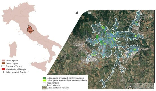 Localization of the Municipality of Perugia, Italy (a), and its urban center (study area) (b).