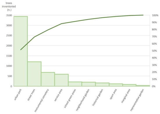 The number of trees inventoried by type of urban green area, to date, in the study area. The dark green line represents the cumulative frequency in percentage.