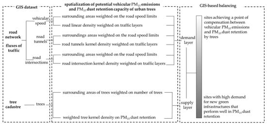 Steps of the method for a GIS-based compensation between potential vehicular PM10 emissions and PM10 dust retention capacity of urban trees.