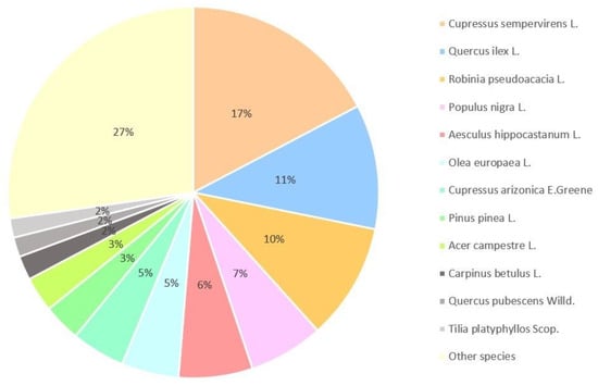 Main species of the tree cadastre of Perugia, covering in total 73% of the evaluated species.