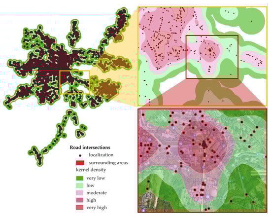 The road network has a density of 15 km/km2, with a speed limit between 30 and 110 km/h. Following the method described in the previous section, the heatmaps differentiated for the input layers (vehicular speed, road tunnels, road intersections, and trees) were realized. Then, the GIS-based balancing map was calculated. Figure 5 shows an example of the first findings for the road intersections layer, and Figure 6 shows the demand, supply, and balancing maps.