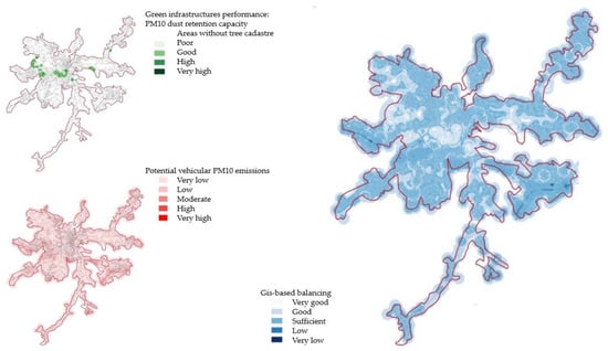 Finally, the method develops a GIS-based balancing map through the difference between the demand and supply layers. High values of this map represent sites achieving a point of compensation between PM10 emission by vehicles and PM10 dust retention by GIs. In contrast, low values represent sites with high demand for new green infrastructures performing well in PM10 dust retention. The method also suggests which species could be used with Equation (1).