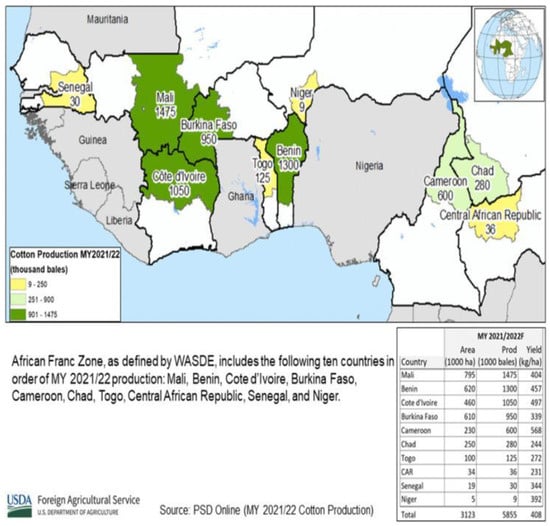 - Coulibaly, H.T. The Progress of West African Cotton Production and Trade. In Agricultural Outlook Forum 2017; United States Department of Agriculture: Washington, DC, USA, 2017. [Google Scholar]