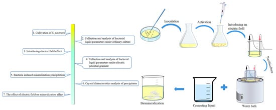The experiment was divided into two main parts. In the first part, physical and chemical parameters such as bacterial concentration and activity under standard culture conditions were determined by cultivating S. pasteurii. The optimal stage for introducing an electric field was identified. In the second part, the effect of the electric field on the mineralization reaction induced by S. pasteurii was investigated by introducing an electric field into the cultivated S. pasteurii. The flow diagram of the test is shown in Figure 2.