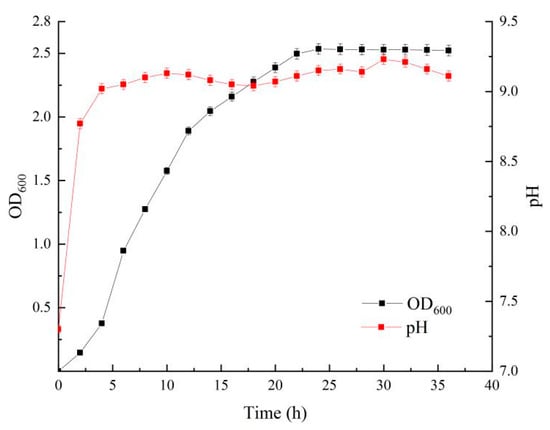 The above equation applies only when the OD600 is within 0.2 to 0.8. If the bacterial concentration exceeds the upper limit of the measurement range, the resulting count will include both viable and nonviable cells. Hence, the spreading plate method was employed to accurately determine bacterial growth during cultivation by determining viable cell counts. Additionally, the pH of the bacterial solution was directly measured using a pH meter.