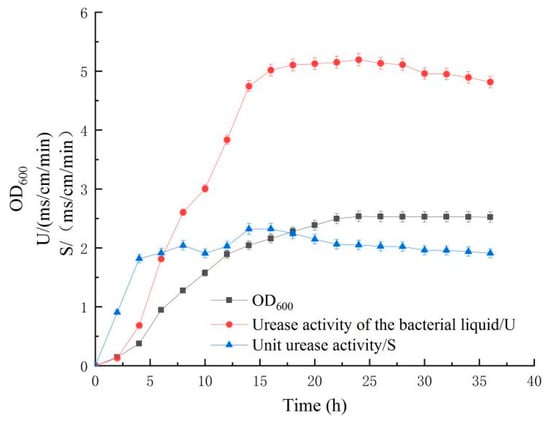 Add 3 mL of the tested bacterial solution to 27 mL of 1.5 mol/L urea and use a conductivity meter to measure the change in conductivity of the mixed solution within 5 min after thorough mixing. The urease activity of the bacterial liquid and its change in unit urease activity can be obtained by conversion, as depicted in Figure 4. This study’s lag period is not apparent due to the prior cultivation of S. pasteurii in multiple cycles. It can be observed from the figure that the bacterial adaptation to the culture environment is faster in the 0–2 h timeframe, and the bacterial count increases gradually. Between 2 and 16 h, the bacteria begin to grow after an adaptation period. The bacterial cell division leads to a linear increase in the bacterial concentration in the culture medium. This stage corresponds to the logarithmic phase of bacterial culture, during which the growth rate is maximized.