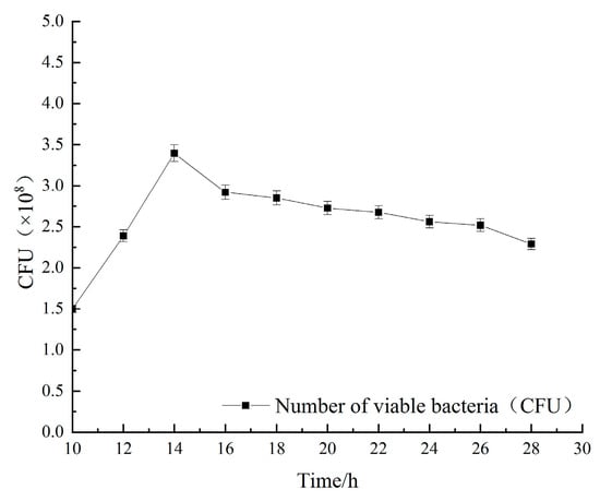 In order to investigate alterations in colony-forming units (CFU) of viable bacteria in S. pasteurii under standard culture conditions, samples were collected from 10 to 28 h post-culture initiation and cultured using the plate colony counting method. The resultant alteration trend in the viable bacterial count is presented in Figure 5 (p < 0.05). Sampling time nodes in the figure comprised logarithmic, late stable periods, and others. It can be observed from the figure that the viable bacterial count increased linearly with the logarithmic phase’s growth in the bacterial concentration. The highest viable bacteria count was observed around 14 h, reaching cells/mL. Subsequently, due to unfavourable factors such as bacterial liquid metabolism in the culture environment, the overall bacterial concentration reduced, leading to a decline in viable bacterial proportion and a continuous reduction in the viable bacterial count. The considerable changes in the number of viable bacteria substantially affect the unit urease activity in the bacterial solution.