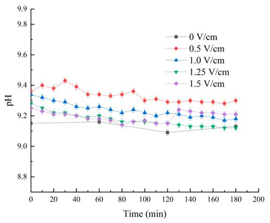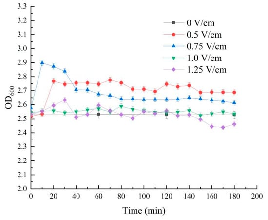 Figure 8 illustrates the effect of electrification on the pH value of the bacterial liquid. Fluctuations in pH value are observed in the bacterial liquid under each potential gradient, compared to the control group at 0 V/cm. The best promotion of bacterial regrowth occurs under a gradient of 0.5 V/cm. Due to the high OD600 of the bacterial solution used, there is a high consumption of nutrients in the medium, resulting in a limited pH increase under the electric potential gradient. Nonetheless, the overall trend still demonstrates the growth and inhibition of bacteria under each gradient. The change in pH value corresponds to the growth curve, with the bacterial concentration increasing under the gradient of 0.5–0.75 V/cm and the pH value rising accordingly. In the later stages, the bacterial concentration of the bacterial solution stabilizes, and the pH change decreases gradually.