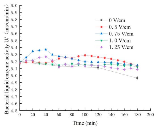 In order to investigate the impact of the applied electric field on the activity of the bacterial liquid, samples were taken every thirty minutes for conductivity measurements. The urease activity was transformed using the conductivity conversion Formulas (7) and (8), and the specific changes are depicted in Figure 9. During the initial stage of electrification, the electric field caused the surface potential of the cell membrane of the bacteria to change, which in turn affected the membrane’s permeability. The difference in osmotic pressure inside and outside the bacterial cell enabled the culture environment’s nutrients to enter the bacterial body more efficiently. Furthermore, anode electrolysis produced oxygen [39], promoting the proliferation and metabolism of bacteria. This phenomenon was particularly notable at lower potential gradients. At a gradient of 0.5 V/cm, the urease activity increased gradually with the concentration of the bacterial solution. However, in the later stage, the bacteria began to decay progressively due to nutrient depletion, reducing the bacterial liquid’s activity. When the potential gradient was 0.75 V/cm, the bacterial concentration increased rapidly due to the promotion effect caused by the initial electric field.