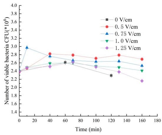 The S. pasteurii cells were found to have a negative charge during the experiment. Previous research suggests that the biological activity of bacteria can be activated by a weak electric field [44]. This is because the hydrogen and oxygen produced by electrolysis in a weak electric field can promote the growth of bacteria, enhance membrane permeability, and accelerate nutrient exchange in the culture environment. In order to investigate the number of viable bacteria at different electric potential gradients as the concentration changes, the bacterial solution was divided into sections every 30 min and plated. The changing trend of viable bacteria is illustrated in Figure 10. The results show that the change in viable bacteria, as measured by CFU, is highly consistent with the changing trend of OD600. During the initial phase of electrification, the bacterial concentration substantially rose under the 0.75 V/cm gradient, leading to a corresponding rapid increase in viable bacteria. However, upon suppression of the electric field, the bacterial concentration and viable bacteria count subsequently decreased. The weak electric field generated by the 0.5 V/cm potential gradient significantly affected the growth activity and cell proliferation of S. pasteurii, as evidenced by the relatively stable growth trend of the number of viable bacteria. As the number of bacteria increased, the activity of the bacterial liquid also increased, and the ability of the urease produced by the bacteria to decompose urea was further strengthened, which promoted the proliferation of the pH value of the culture environment. Compared to higher potential gradients such as 1.0 V/cm and 1.25 V/cm, the number of viable bacteria was relatively unchanged due to the suppression of the electric field. A reduced magnitude of potential gradient (e.g., 0.5 V/cm) demonstrated a favorable impact on bacterial proliferation, presenting a potential avenue for further experimental investigations.