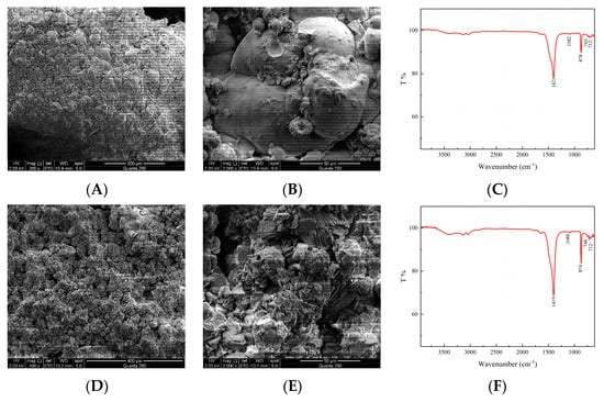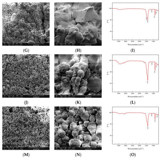 Furthermore, the quantity of ellipsoidal formations within the calcium carbonate crystals exhibits an increase. Many agglomerated ellipsoidal crystals adhere to a limited number of polygonal crystal structures, leading to a division in structural hierarchy. Infrared spectrum analysis (Figure 12I) reveals that most absorption peaks lie at 1404 cm−1, 1082 cm−1, 874 cm−1, and 742 cm−1, all indicative of vaterite calcium carbonate. Compared with a 0.5 V/cm gradient and the absence of electrical influence, the characteristic calcite-type absorption peak at 1420 cm−1 shifts, mainly due to the anti-symmetric stretching vibration of the C-O bond under the effect of electrification, resulting in the emergence of a weak calcite-type acromion at 1439 cm−1. Coupled with SEM outcomes, the calcium carbonate formed at a 0.75 V/cm gradient is chiefly of the vaterite type with a small number of calcite crystals. As the potential gradient increases, the spherical structure becomes dominant in the calcium carbonate precipitate crystals formed by the influence of a gradient ranging from 1.0 to 1.25 V/cm (illustrated in Figure 12J,K,M,N). The crystal shapes are regular and spherical, and their distribution is relatively uniform due to the crystal shapes, with no apparent edges or corners. The particles fuse and accumulate, forming a whole with significant pores and poor structural stability. Through infrared spectrum analysis (as demonstrated in Figure 12L,O), the prominent absorption peaks consist of 1401 cm−1, 874 cm−1, 748 cm−1, 745 cm−1, and so on. By consulting the infrared characteristic absorption peak data of various crystal forms, it becomes apparent that only vaterite calcium carbonate exists.