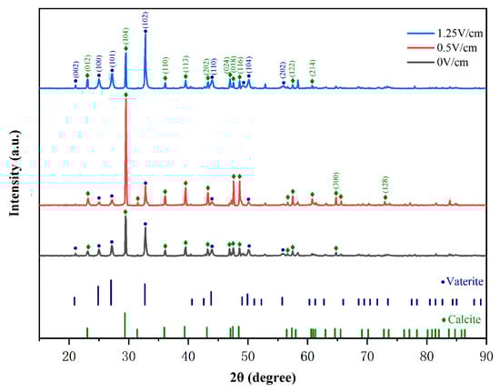In order to investigate the crystal composition of MICP reaction products in an electric field, three different calcium carbonate precipitates (0 V/cm, 0.5 V/cm, and 1.25 V/cm) underwent X-ray diffraction (XRD) analysis, building upon the results of SEM and FT-IR analyses.