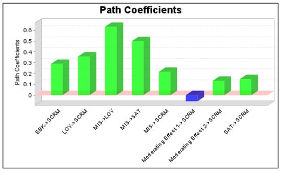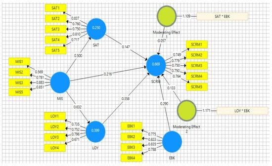 | MIS | SAT | LOY | EBK | Moderating Effect 1 (SAT × EBK) | Moderating Effect 2 (LOY × EBK) | Effectiveness of Sustainable CRM | |