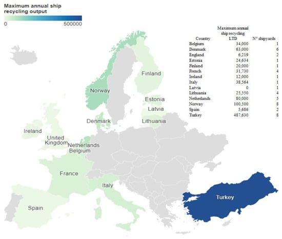 Ref. [31] investigated over 22,500 business records of ships scrapped from 2000 to 2019, estimating that 22,547 ships were scrapped worldwide, representing 357,365,473 GT dismantled. 80% of the main ship recycling destinations are in South Asia; even though the European Union has a large ship demolition yard park, only a small portion of the ships sent to demolition yards reaches European coasts. As stated by the [19], the recycling capacity of facilities located in OECD countries is insufficient to meet the demand for ships intended for recycling, and thus the recycling rate is less than 5%.