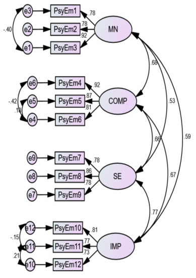 To test the measurement models of the PsyES, AMOS 23.0 was used to calculate a confirmatory factor analysis (CFA). Table 3 and Figure 1 show the CFA results, which in turn show that the overall goodness-of-fit chi-square was employed as a fit index for the model. The following metrics have the necessary threshold for the model fit: root mean square error of approximation (RMSEA), adjusted goodness of fit index (AGFI), comparative fit index (CFI), standardized root mean square residual (SRMR), chi-square/df (cmin/df), goodness of fit (GFI), and PCLOSE. The data’s fit to the model was enhanced by the correlation between unobserved variance (e1–e12) that was constructed based on the modification indices’ recommendations, leading to a potential tetra-dimensional PsyEM. Each item’s factor loadings were evaluated as part of the CFA, and all items were retained due to appropriate factor loadings. The factor loading between the items (PsyES1 and PsyES12) and their respective constructs (meaning, competence, self-determination, and impact) were more than the recommended value (>0.5).