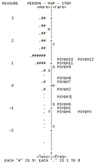 The Rasch analysis used in this study adhered to Linacre’s recommendations [18]. Winsteps software version 5.2.2.0 was employed for Rasch analysis. Good indicators of the overall fit included a non-significant chi-square and a mean (MnSq) for the item and person residuals close to zero. Items with threshold disorders were searched for using threshold maps and response category curves. The residuals outside the range of 2.5 were regarded as a misfit when considering the item and person statistics. The person separation index (PSI) was used to check internal consistency, and a value of 0.7 or higher was found [20]. The scale’s dimension was also scrutinized. The internal validity of the PsyEMS was examined using principal component analysis. Examining item fit statistics and running a principal component analysis of the residuals can determine the degree of dimensionality. For an instrument to be considered unidimensional, the first component must account for more than half of the total variance. The item’s hierarchy decides how difficult a task will be based on a person’s aptitude. Along a measurement continuum, the Rasch model calculates item locations (calibrations). Scale item severity is ranked by item calibration. Rasch’s model demonstrates how well items fit into a group. The log-odds units (logits) used to describe item calibration indicated the difficulty of the items by virtue of their larger magnitude. The ideal participant distribution matched the ideal item distribution. In this study, an item map and a continuum were used to assess item difficulty. This is referred to as a Wright Map. Rasch person and item measurement data are shown. The same logit scale is used to plot both the person and item measurements. With the aid of a Wright Map, a researcher can examine the distribution of items, respondents’ locations, and test takers’ performance using the test items’ collection to explain the test takers’ abilities.