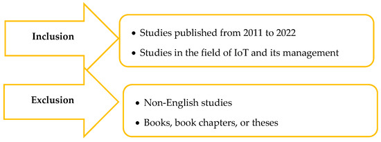 The papers that met the following criteria were included: (1) studies with any perspective in IoT-based digitalization using the ML methods; (2) published studies from 1 January 2018 until 10 December 2022; (3) studies published in English in a peer-reviewed journal. Additionally, studies were omitted if they were: (1) reviews, notes, commentaries, or editorials related to IoT-based digitalization, (2) duplicate articles, or (3) articles that described the study protocol or study design.