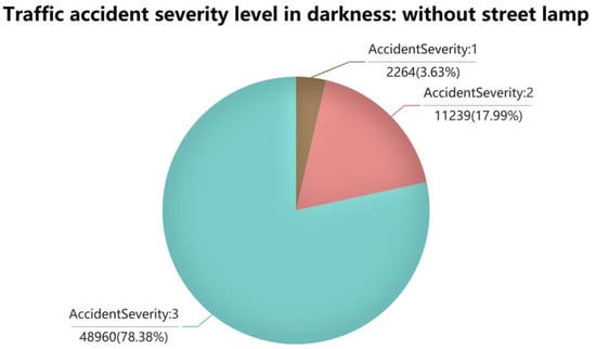 The severity of the accident is classified into three levels. Level 1 traffic accidents are the most serious, meaning that accidents cause many casualties. Level 3 accidents are the most common and minor, meaning fewer vehicle collisions and people injuries. Therefore, the pie chart can show the proportion of accidents of the three different severity levels under various factors.