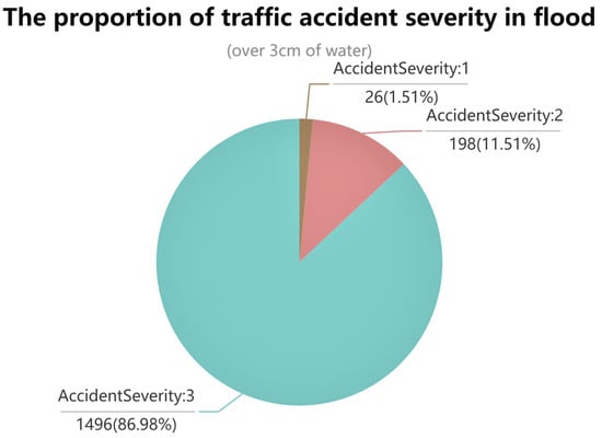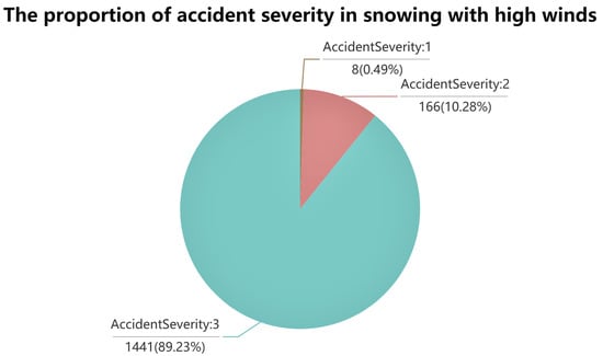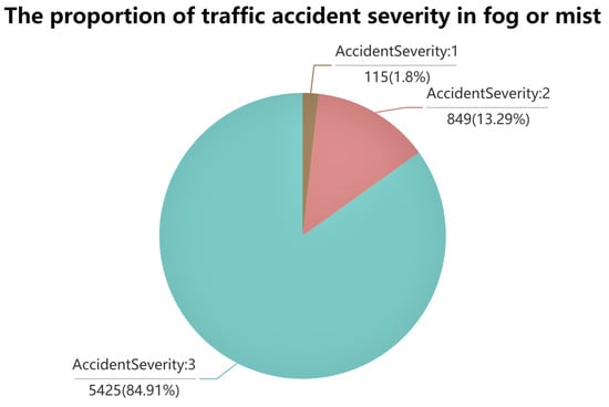 Weather conditions are analyzed in terms of wind, rain, snow, fog, normal, and other weather conditions. Figure 2 shows that foggy days can cause more severe traffic accidents than other kinds of weather. Snowing with high winds is least likely to cause serious traffic accidents. In terms of road surface conditions, snow, dry, wet, flood, and other conditions are analyzed. Figure 3 shows that flooded road surfaces can cause more severe traffic accidents. However, snow roads are less likely to cause serious accidents. Fog weather is more likely to cause serious traffic accidents. A possible reason is that the fog blocks the drivers’ view of the road. They cannot accurately judge the distance of the pedestrians or vehicles ahead. One possible explanation for accident severity being the lowest on snowy days is that people drive slower and maintain a higher concentration level. A reasonable assumption for accident severity being highest in flood is that it reduces the friction on the road surface, making it easier for vehicles to slip and roll over due to inertia when braking, emergency acceleration, or turning. A likely reason for accident severity being lowest in the snow is that when there is a lot of snow on the road, people often install anti-skid chains and drive at low speeds.