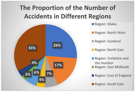 From the perspective of spatial dimension, as shown in Figure 4, the number of traffic accidents that occurred in the southeast of the United Kingdom was highest from 2005 to 2014, which was close to 33% of the whole country, while the number of traffic accidents occurred in the East Midlands was the least, accounting for only 2.6%. From the perspective of the time dimension, as shown in Figure 5, from 2005 to 2011, the number of traffic accidents in the UK was decreasing year by year. This number rebounded slightly in 2012 but has continued to decline since then. From the perspective of the time dimension, as shown in Figure 5, from 2005 to 2011, the number of traffic accidents in the UK was decreasing year by year. This number rebounded slightly in 2012 but has continued to decline since then.