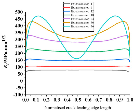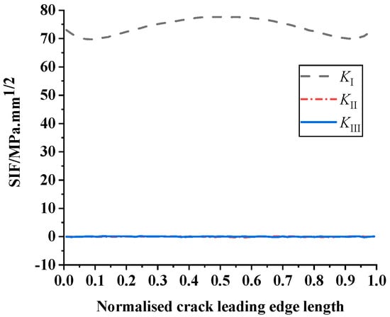 The normalized stress intensity factor (, and ) calculation results of the initial crack front are shown in Figure 2. The calculation at the position 0.5 corresponds to the calculated value of the stress intensity factor at the deepest point in the short semi−axis of the semi−elliptical crack, and SIF represents the stress intensity factor value.