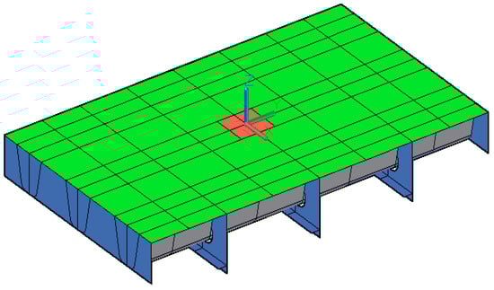 The test is based on an urban rail transit cable-stayed bridge with a main span of 340 m. The size of the model is designed according to the structural size of the steel deck of the bridge, and the model is simplified according to the actual situation. The Q345qD steel material is used as the model material. Three U-ribs with a spacing of 600 mm are set in the transverse bridge direction, and three diaphragm plates with a spacing of 827 mm are set in the longitudinal bridge direction. The 12-mm-thick steel plates are used at both ends for heads, and the size is 1800 mm × 121 mm × 281 mm. The steel box is placed at the lower part of both ends of the bridge deck and used as a support to keep the deck horizontal. The overall dimension of the model is 3000 mm × 1800 mm, and the thickness of the deck, diaphragm and U-shaped longitudinal rib is 16 mm, 12 mm and 8 mm, respectively. Since the restraints between the diaphragm and the U-rib will produce secondary bending stress, in order to reduce this stress, appropriate notches are usually made at the intersection between the lower part of the U-rib and the diaphragm, and the notch radius of the model designed for this fatigue test is 25 mm. The front view and three-dimensional view of the model are shown in Figure 6 and Figure 7, respectively.