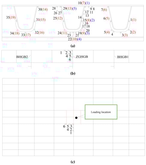 Layout of measuring points: (a) Layout of measuring points of the middle diaphragm; (b) Layout of U-rib measuring points; (c) Layout of roof measuring points.
