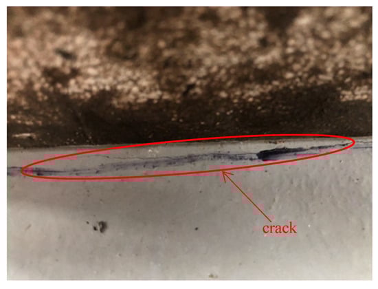 At the completion of 2 million cycles of loading, the fatigue load amplitude was 121.6 kN, and no fatigue crack was found after careful observation. At 2 million to 2.5 million and 2.5 million to 3 million cycles, the fatigue load amplitude was increased to 1.25 and 1.5 times the original one, respectively, and no crack that was visible to the naked eye appeared on the test model. At 3 million to 3.25 million cycles, the fatigue load amplitude went up by 1.75 times the original one, and a crack of 15.1 cm in length appeared near the boundary of the loading location. At 3.25 million to 3.5 million cycles, a crack of 18.6 cm appeared. The fatigue cracks in the test model are shown in Figure 10.