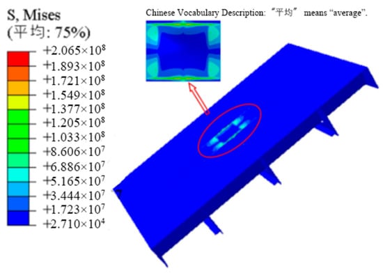 ABAQUS modelling software is used to build a whole model without an initial crack, and the load and boundary conditions of the whole model are the same as the test model. The model and calculation results are shown in Figure 11, Figure 12, Figure 13 and Figure 14. The elements in the crack extension area are set into a group and defined into a sub-model; then, the model is imported into Franc3D, so an initial crack is inserted into the sub-model and the mesh is regenerated [30,31].