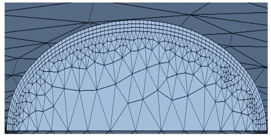 From the test results, it can be seen that the cracks appear at the junction of the top plate–U-rib–middle diaphragm and crack downwards from the top surface of the top plate, so this section is devoted to an extended analysis of the cracks at this point. According to the study of fatigue cracking by Ya et al. [28] and Chen Chuanyao, Liu Yanping et al. [29], the shape of the fatigue crack can usually be approximated as a semi-ellipse, and it is assumed in this section that the initial half short axis of the crack is 0.1 mm and the half long axis is 0.15 mm; the structure is considered to be damaged when the depth of the crack penetrates the top plate, and the corresponding number of cyclic loads is the fatigue residual life of the OSD model structure.
