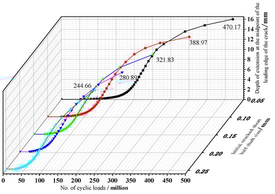 Because the OSD structure is very complex, coupled with environmental and manufacturing factors, it is inevitable to produce initial defects. Generally, the initial crack size can be obtained by a nondestructive evaluation method or an equivalent initial defect size method. In order to investigate the effect of the initial crack size on the remaining fatigue life of the OSD structure, the stress intensity factor amplitude at the midpoint of the leading edge of the initial crack (tip of the short semi-axis) and the number of cyclic loads required to damage the structure (remaining fatigue life of the structure) are calculated for different sizes at a ratio of 3/2 between the long and short semi-axes. The relationship between the propagation depth of the middle point of the crack front and the amplitude of the stress intensity factor () is shown in Figure 26, and the relationship between the propagation depth of the middle point of the crack front and the number of cyclic loads is shown in Figure 27.