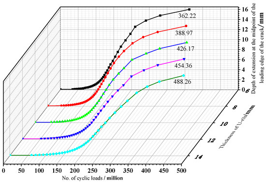 It can be seen from the above two figures that the thickness of the U-rib has a certain impact on the service life of the OSD structure. That is, with the increase in the thickness of U-rib, the amplitude of stress intensity factor at the middle point of the crack front decreases, and the fatigue life of the structure increases. This is probably due to the fact that the increase in U-rib thickness increases the stiffness of the structure as well as the load-carrying capacity; therefore, an appropriate increase in U-rib thickness can improve the service life of the structure while taking into account economic factors.