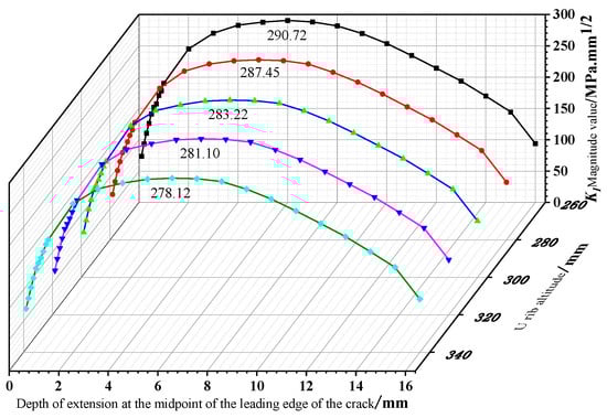 - The Mode I stress intensity factor of the initial crack is symmetrically distributed, and the value is large, reaching 77.67 MPa. The stress intensity factors of Type II and III fluctuate around 0 MPa·mm1/2, which belongs to the crack type dominated by the Mode I crack;