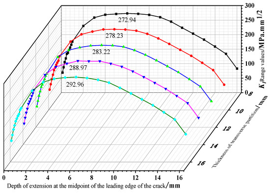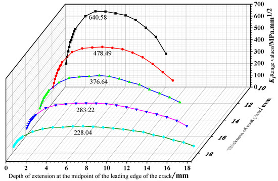 The simulation of the test model by the different thicknesses of the top plate and all other constant parameters are conducted. The relationship between the propagation depth of the middle point of the crack front and the amplitude of the stress intensity factor () is shown in Figure 32, and the relationship between the propagation depth of the middle point of the crack front and the number of cyclic loads is shown in Figure 33.