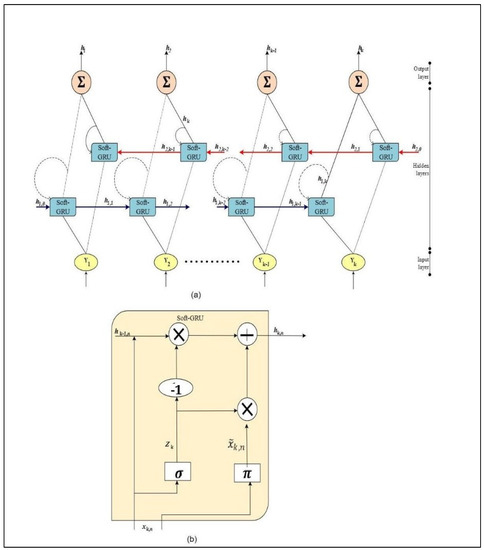 (a) Bidirectional RNN with layers. (b) Architecture of bidirectional RNN using soft GRU.