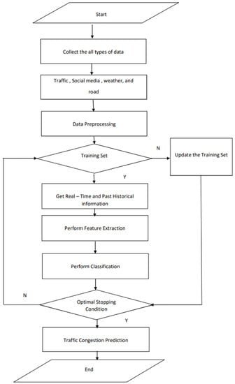 For a few decades, road traffic prediction has drawn increased attention. Each country has been experiencing traffic congestion challenges due to the building of infrastructure. As a result, forecasting the congestion can help the authorities prepare and take the appropriate steps to avoid it. Researchers have started using several models in this area as a result of the advancement of AI and the accessibility of extensive data. Probabilistic models are generally straightforward, but when many elements, such as the weather, social media, and events, which influence traffic congestion, are considered, they become more complicated. In this situation, ML, profound learning, is advantageous. Because they can evaluate an extensive dataset, DL algorithms have grown in popularity over time. The amount of research on predicting traffic congestion is growing tremendously. Most investigations employed static sensor or camera data from the two sources. Whereas sensor data cannot capture dynamic traffic changes, numerous source changes make assessing flow patterns for probe data challenging. An essential consideration in studies of traffic congestion is the data-gathering horizon. As traffic is dynamic, the short time frame of a few days cannot depict the actual state of the bottleneck. The seasonality’s limitations were demonstrated by other research that employed data spanning a few months [31,32,33,34,35].