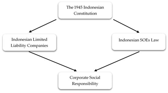 The legal framework for CSR as a form of sustainable development in the economy is not specifically stipulated in one area of law, but is spread over several regulations instead, as shown in Figure 3. CSR are stipulated in regulations concerning the company according to the type of company. For LLCs, it is specified in Law No. 40 of 2007 on Limited Liability Companies (Indonesian Limited Liability Companies Law) and its implementing regulation, Government Regulation No. 47 of 2012 on Social and Environmental Responsibility of Limited Liability Companies. For SOEs, CSR implementation is specified in Law No. 19 of 2003 on State-Owned Enterprises (Indonesian SOEs Law) and its implementing regulation, namely the Minister of State-Owned Enterprises Regulation No. PER-02/MBU/04/2020 of 2020 on Partnership Programs and Community Development Programs for State-Owned Enterprises.
