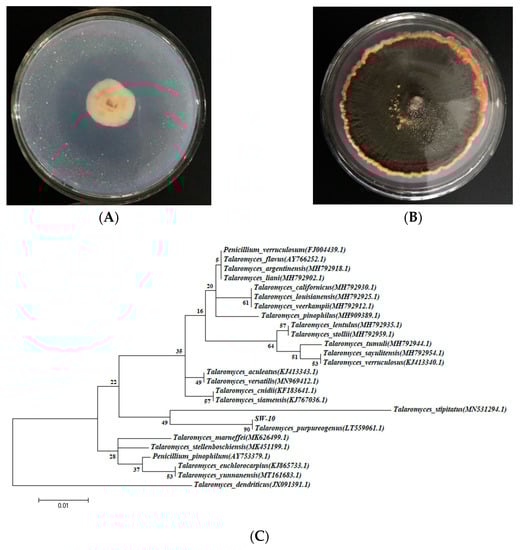The primary hyphae of SW-10 were white in color, which gradually turned orange on the PDA medium. After seven days of incubation in the dark at 28 °C, dark green conidia appeared in the center of the colony, orange hyphae in the margin, and red pigments at the bottom (Figure 1B). Optical microscopes were used to examine the spores and conidiophores of the PSF. SW-10 presented typical penicillate conidiophores with conidia. Based on the phylogenetic analysis of rDNA ITS and β-tubulin region sequence, the SW-10 strain was identified as Talaromyces purpurogenus (Figure 1C), and was deposited at the China General Microbiological Culture Collection Center (CGMCC) (accession number: CGMCC No. 20737).