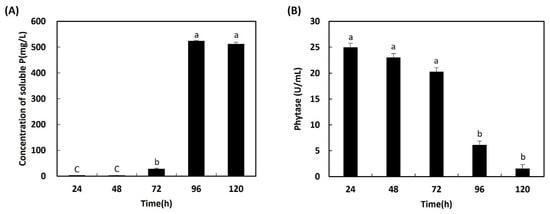 Concentrations of soluble P mineralized by SW-10 strain (A) and changes in phytase activity (B). The different letters above the SD bars indicate very significant difference at p ≤ 0.05.