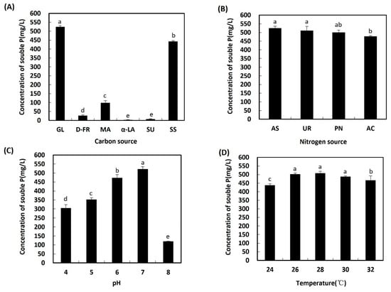 Effects of different culture conditions including carbon source (A), nitrogen source (B), pH (C) and temperature (D) on the phosphate-mineralizing capacity of SW-10 strain. Carbon source: GL: glucose, D-FR: D-fructose, MA: maltose, α-LA: α-lactose, SU: sucrose, SS: soluble starch; nitrogen source: AS: ammonium sulfate, UR: urea, PN: potassium nitrate, AC: ammonium chloride. The different letters above the SD bars indicate very significant difference at p ≤ 0.05.