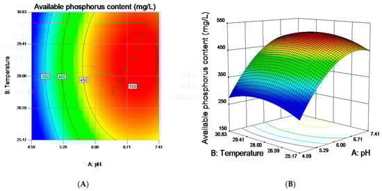 Contour plot (A) and response surface plot (B) for available phosphorus content by SW-10.
