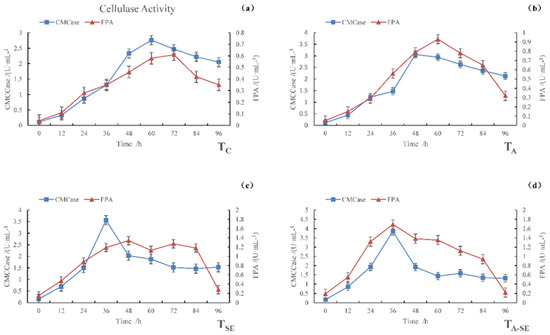 In Figure 1, it can be seen that the carboxymethyl cellulase (CMCase) activity and filter paper activity (FPA) varied over time in all four sample groups. The maximum CMCase activities were observed for TC, TA, TSE, and TA-SE samples at 2.76, 3.06, 3.56, and 3.85 U·mL−1, respectively, after 60, 48, 36, and 36 h of fermentation, respectively. The maximum FPA activities were observed for TC, TA, TSE, and TA-SE samples at 0.61, 0.93, 1.34, and 1.69 U·mL−1, respectively, after 72, 60, 48, and 36 h of fermentation, respectively.