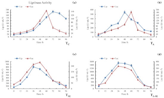 LiP and Lac activities during the SSF process. (a) TC, (b) TA, (c) TSE, and (d) TA-SE.