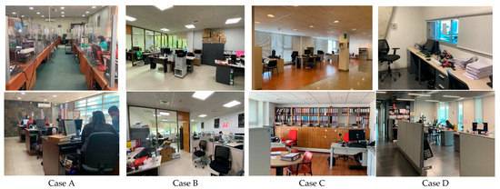 Figure 3 shows images of inside the case study offices. It is seen that case A has the highest number of people sharing the same space (up to 19), and it is this case where occupants have the least control over environmental conditions (Table 3). At the same time, in Case B, where the offices are more limited in size than in the rest of the cases, the control is quite similar in all the environmental aspects consulted, except for noise, which appears as the least controlled in all the cases.