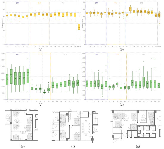 Temperatures and CO2 levels obtained for each office in Case B: (a) temperatures in winter; (b) temperatures in summer; (c) CO2 in winter; (d) CO2 in summer; (e) office 1; (f) office 2; (g) office 3.