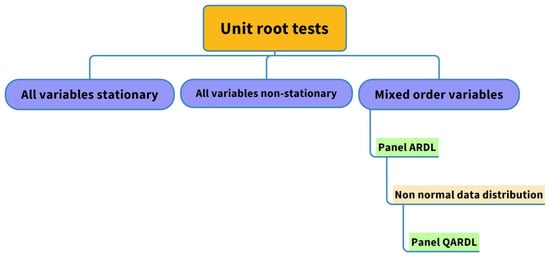 The information in Equation (2) is comparable to that in the ARDL-PMG formula, which was created by Pesaran et al. [53]. Equation (2) includes short- and long-run estimates, represented by “first-differenced” coefficients and φ_1-φ_4 the coefficients, respectively. The long-run relationship is assumed to be incorrect unless we can prove cointegration between the long-run parameters; hence proving cointegration is one major challenge we must tackle when coping with the long-run results. There must be some diagnostic tests to verify the cointegration relationship between the variables. Pesaran et al. [53] developed two tests, the F-test or t-test (also known as the ECM test), which is collected via a combination of Equations (1) and (2). The null of the F-test suggests that there is no cointegration, while the alternative hypothesis represents the existence of a long-run relationship. Critical values for the F-test and t-test are suggested by Pesaran et al. [53]; they must be lower than estimated values in order to demonstrate long-run cointegration. There are benefits to using this procedure rather than others. To start, compared to numerous panel cointegration techniques, which require parameters to be stationary at (1), this approach may be used with the parameters that are I(0), I(1), or a combination of I(0) and I(1). Even though the ARDL model does not require checking the stationary properties of the variables, the ARDL can’t take care of any I(2) variables. Thus, as a precautionary measure and to confirm that none of the variables are I(2), we have applied three unit root tests such as Levin, Lin, and Chu (LLC), Im, Pesaran, and Shin (IPS), and ADF tests. The notion of cross-sectional independence is essential to both IPS and LLC. When doing panel unit root tests, the null hypothesis is that the panel series is stationary, whereas the alternative hypothesis is that the panel series is non-stationary. Second, whereas most other methods can only look into long-term estimations, this approach is one of the uncommon ones that can look into both short- and long-term ones at the same time. Finally, this is an efficient approach to coping with a small data collection. On the opposite side, some other panel cointegration methods can only provide reliable findings if the series has been gathered over a considerable time span. This approach also incorporates a dynamic strategy for short-term change. Thus, any feedback influence between variables may be applied using this method, which aids in getting rid of endogeneity [54]. While ARDL was employed as the primary method for this research, we likewise utilized QARDL to ensure the validity of our findings. When non-normality arises, the QARDL approach yields accurate estimations (see, Figure 1).