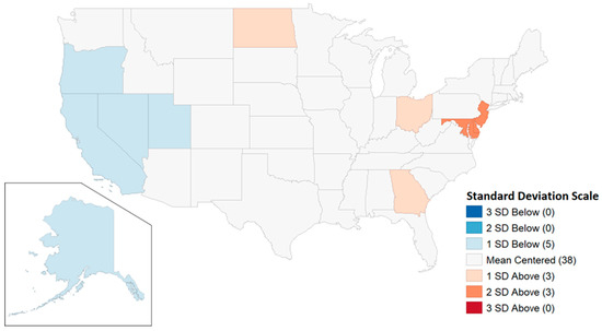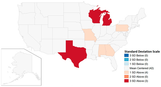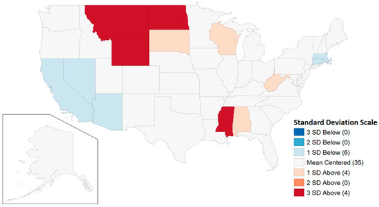 Another way to examine the deer taking data is through the use of hot and cold spot maps. Maps examining the distribution of the data based on standard deviations were generated with GeoDa (https://geodacenter.github.io/, accessed on 12 January 2023). Standard deviations from the mean are appropriate since other techniques used for disaggregated data such as the Getis–Ord are not recommended for units of analysis with fewer than eight close neighbors (see ArcGis handbook). Geographically, the majority of US states do not have eight close neighbors, and are bordered by oceans, the Gulf of Mexico, the great lakes, Canada, and Mexico. Following widely agreed upon statistical standards, standard deviations of 2 or more are considered statistically significant. On the maps, however, we also indicate states that are one standard deviation above the mean. Map standard deviations for hot spots are shaded red and are darker for higher standard deviations. Standard deviations above 2 are also shown.