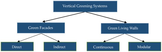 The concept of vertical greening systems (VGSs) or green walls generally refers to systems that can support vegetation that grows vertically up or on a wall surface. This allows VGSs to have minimal or limited ground level space [,,]. VGSs cover at least part of a building façade with supporting structures to hold the vegetation, and can include a growth medium for the plant as well [,]. The term “vertical greening system” is used to describe all types of vegetated wall surfaces. There are different definitions, classification systems, and typologies used in the literature on green infrastructure, but green walls can generally be divided into two categories: green façades (GFs) and living walls (LWs) [].
