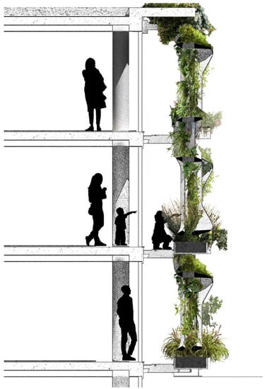 The apertures allow the plants to be maintained from inside through window openings or from maintenance access gantries suspended between the host building’s façade and the façade system, reducing operating costs. This porosity allows for the creation of habitat corridors facilitating the movement of birds, flying insects, and climbing terrestrial animals between and through the apertures of the façade elements. Habitat infrastructure such as nesting hollows, insect hives, and multispecies water stations (bird baths) can be integrated into the structural elements to further support the formation of functional habitat. The size of the apertures can be varied to generate more complex interconnected voids essential for habitat corridors []. This spatial complexity could replicate some of the functions of multilayer canopy ecosystems, by mimicking the canopy stratification found in forests. The multiscale apertures create defensive spaces for smaller birds and animals from predators, such as predatory birds, rodents, and cats, which are essential in providing the trophic cascades necessary to enable a multi-layered ecosystem.