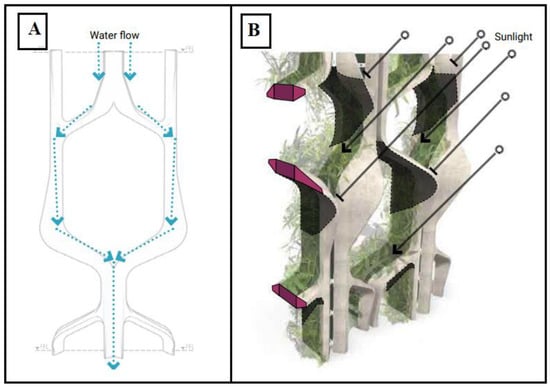 Configuration of the façade allows for a closed irrigation system guiding water directly through the growing substrate (A). The design additionally allows for different solar exposure conditions across the plant-growing substrates through the multiscale apertures (B).